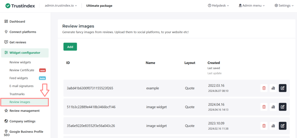 On the left side of the menu, go to the Widget Configurator > Review images menu. Click on Add.